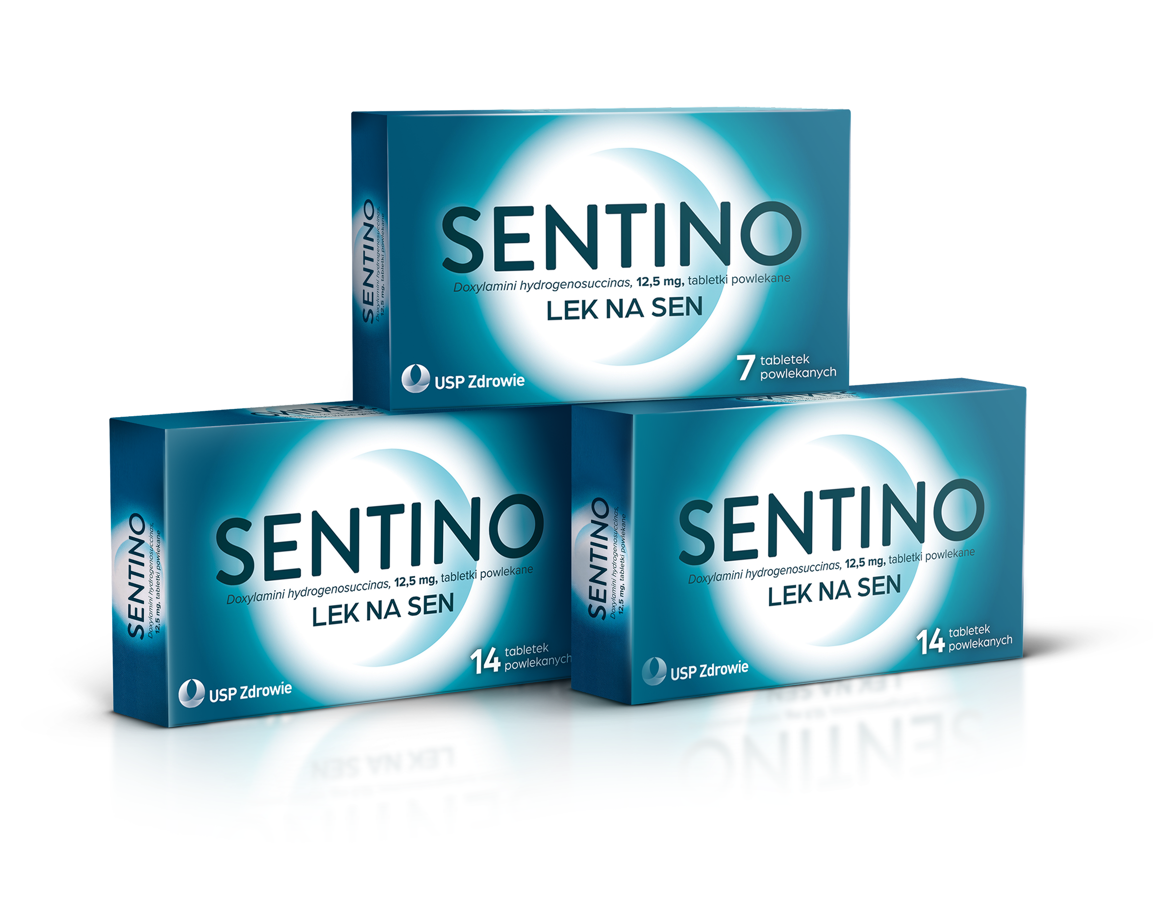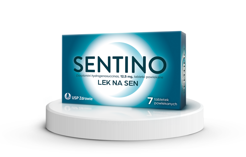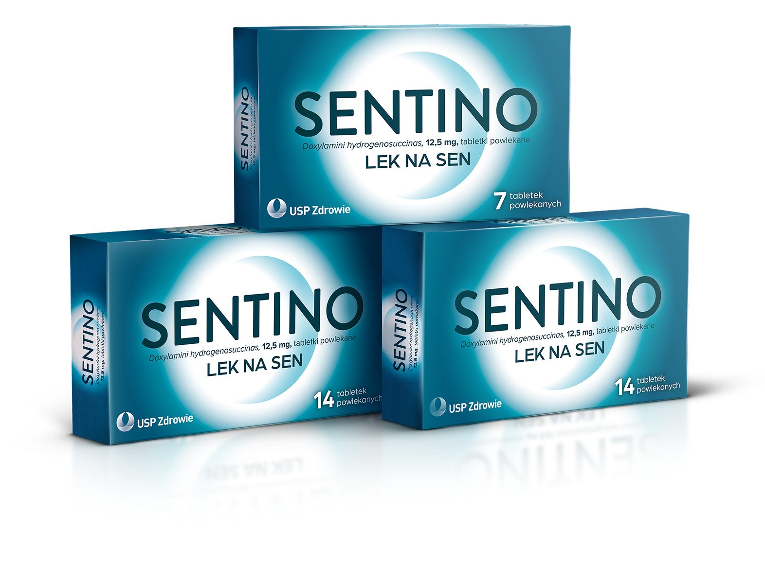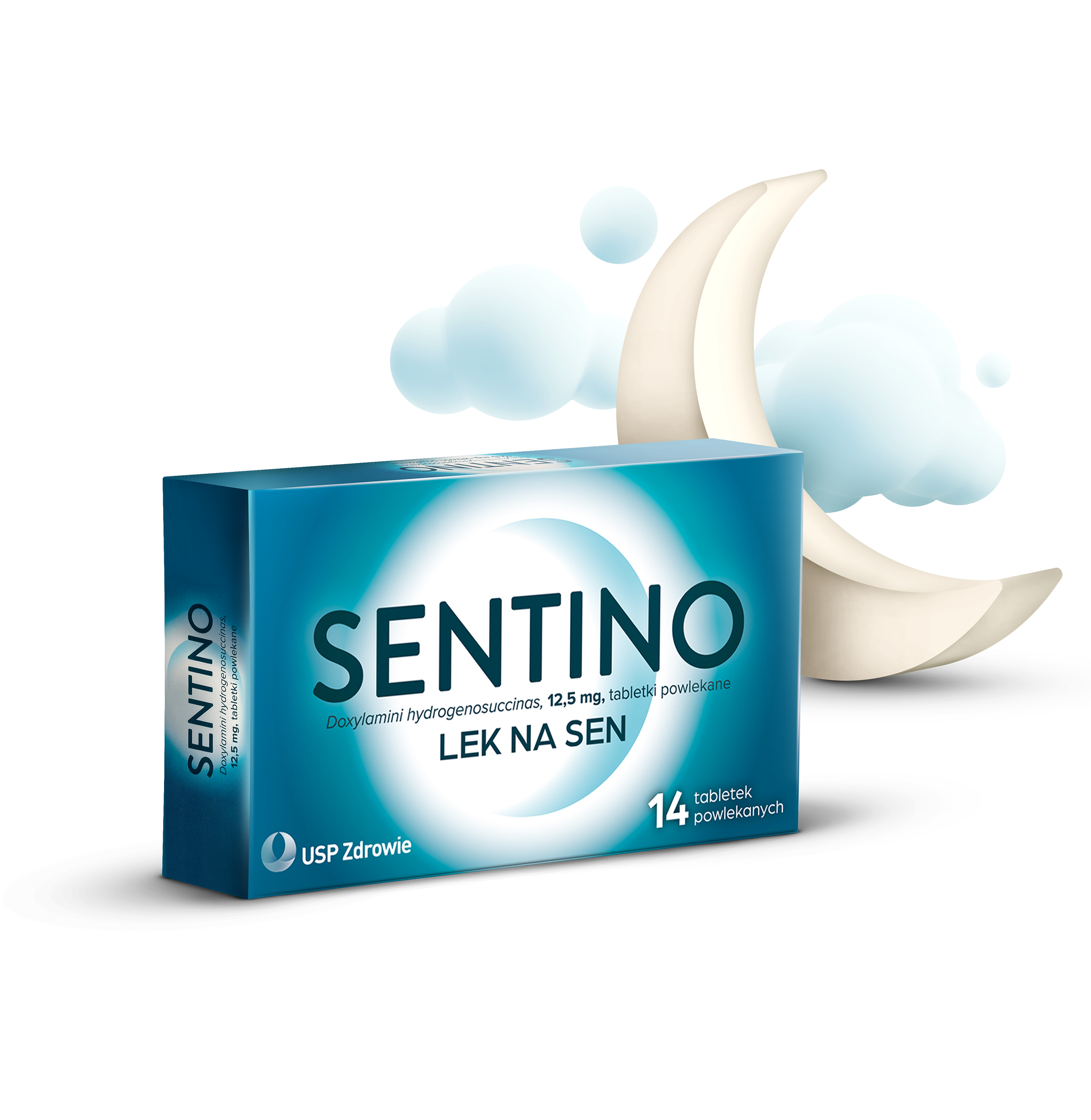 SENTINO jest lekiem zawierającym substancję czynną doksylaminy wodorobursztynian. Doksylamina należy do grupy leków przeciwhistaminowych o działaniu uspokajającym. Lek jest wskazany do krótkotrwałego, objawowego leczenia sporadycznie występującej bezsenności u osób dorosłych, w wieku powyżej 18 lat, zwłaszcza w przypadku występowania: − trudności z zasypianiem, − częstych przebudzeń nocnych, − wczesnego budzenia w godzinach porannych związanych ze stresem bądź zmianą stref czasowych. Sen jest niezwykle ważny. Zaburzenia snu mogą negatywnie wpływać na procesy fizjologiczne i prowadzić do spadku sprawności psychofizycznej. O bezsenności mówimy między innymi wtedy, gdy: czas zasypiania przekracza pół godziny, łączne wybudzenie się w czasie nocy trwa dłużej niż pół godziny, zakłócenie takie występuje co najmniej przez trzy noce w poszczególnym tygodniu i zła jakość snu powoduje zmęczenie lub obniżoną sprawność psychofizyczną w ciągu dnia. Przejściowo występujące zaburzenie snu zwykle trwa kilka dni i jest związane z występowaniem pewnych czynników, takich jak np. stany chorobowe, niepokój, hałas, niewłaściwa temperatura otoczenia czy zmiana strefy czasu. Przyjmowanie leków nie jest podstawową metodą leczenia zaburzeń snu i powinno ograniczyć się tylko do krótkotrwałego stosowania. Przedłużająca się zła jakość snu może być objawem zaburzeń psychicznych i fizycznych, które wymagają innych metod leczenia, co powinno zostać ocenione przez lekarza. Skonsultowanie się z lekarzem jest także konieczne w przypadku występowania innych objawów niż bezsenność. Brak właściwego rozpoznania przyczyny zaburzeń snu i ich leczenia może powodować ryzyko utraty zdrowia. Leczenie choroby podstawowej powodującej zaburzenia snu jest warunkiem koniecznym dla trwałej poprawy jakości snu. Leku nie wolno stosować w leczeniu przewlekłych zaburzeń snu. Okres leczenia powinien być jak najkrótszy. Leczenie trwa zwykle od kilku dni do 1 tygodnia. Leku nie należy stosować dłużej niż przez 7 dni bez konsultacji z lekarzem. Jeśli po upływie 7 dni nie nastąpiła poprawa lub pacjent czuje się gorzej, należy zwrócić się do lekarza.